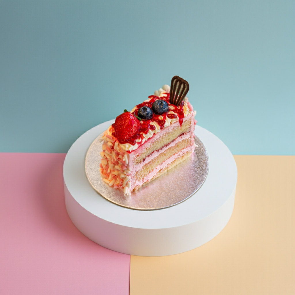 Treat yourself to the sweet and fruity taste of our Strawberry Cake Slice! Made with soft sponge and smooth strawberry cream, it’s light, fresh, and full of flavour.
